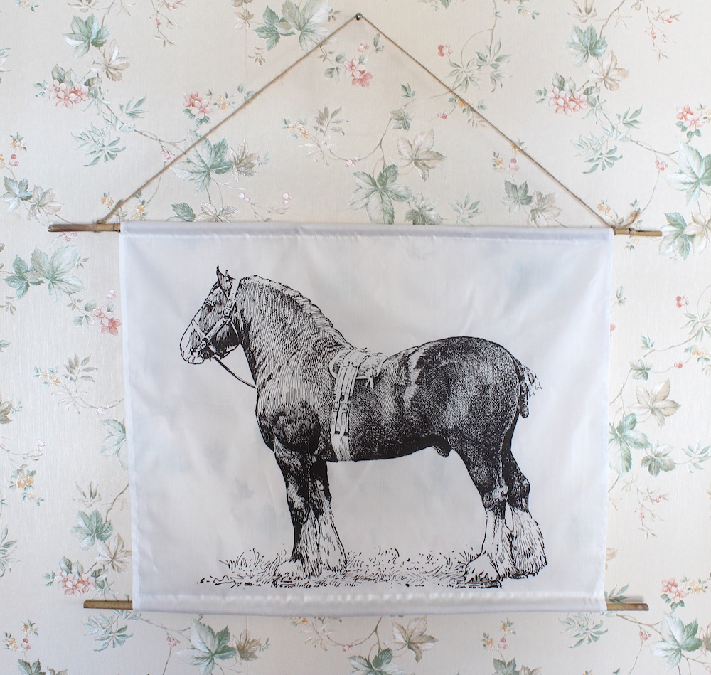 Since my love for Spoonflower is yet to wane, it seemed like a good idea (theoretically, rather than financially) to get some fabric printed with a horse picture and turn it into a nice wall hanging.
